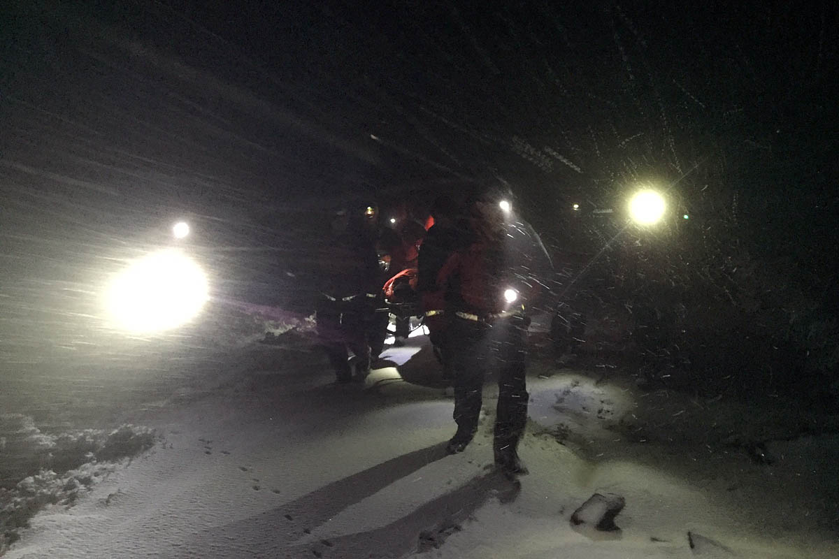 “The stretcher carry was made treacherously slippy by the fast falling snow and took a real team effort to carry the stretcher for 1½ hours to get the lost walker to the roadhead where the ambulance was waiting.”