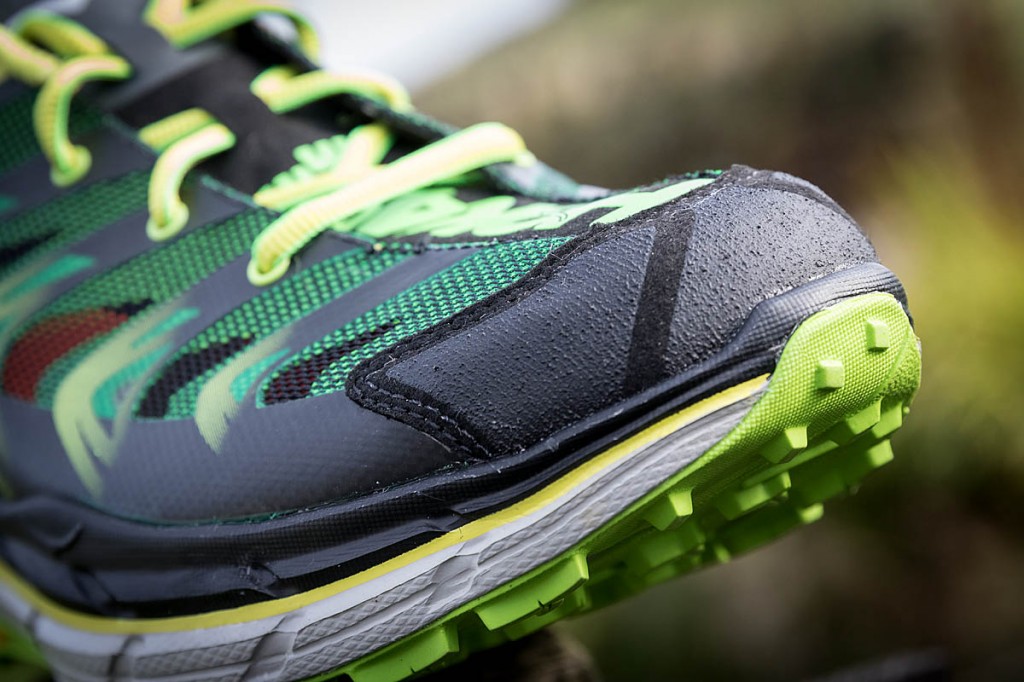 The uppers combine tough-feeling mesh with a bonded-on Speedframe, a plastic skeleton applied both externally and internally, which gives the foot plenty of support. The toe has a rubber section that provides some protection from rocks, though it’s fairly soft. A slightly raised rand keeps out the water in very shallow puddles, but you will certainly get wet feet if running in rain or passing through pools, mud or wet grass.