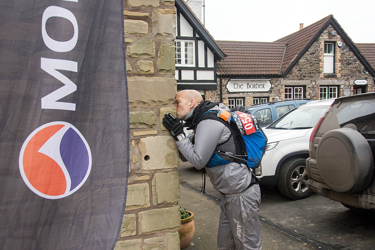 Tom Hollins kisses the wall of the Border Hotel at end of the Spine Race. Photo: Mick Kenyon/Montane Spine Race