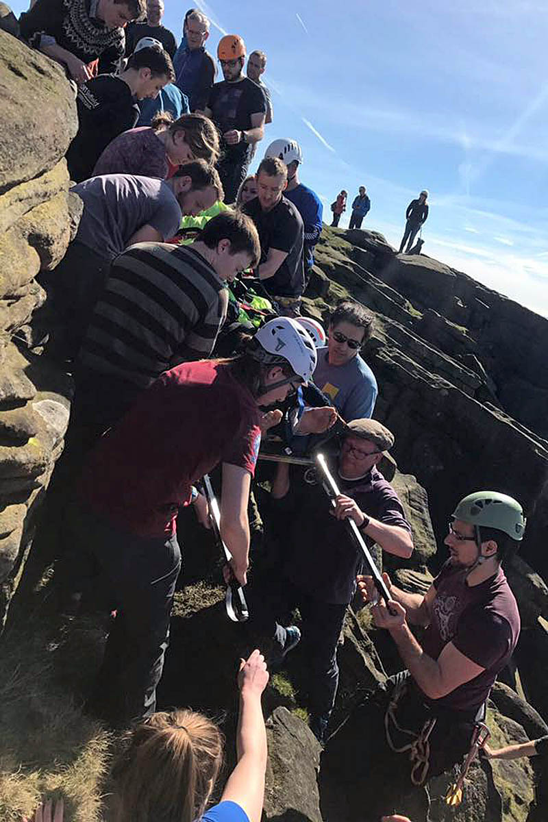 Rescuers have thanked members of the public who helped carry an injured fellow climber over difficult terrain after a fall at a popular Peak District crag.