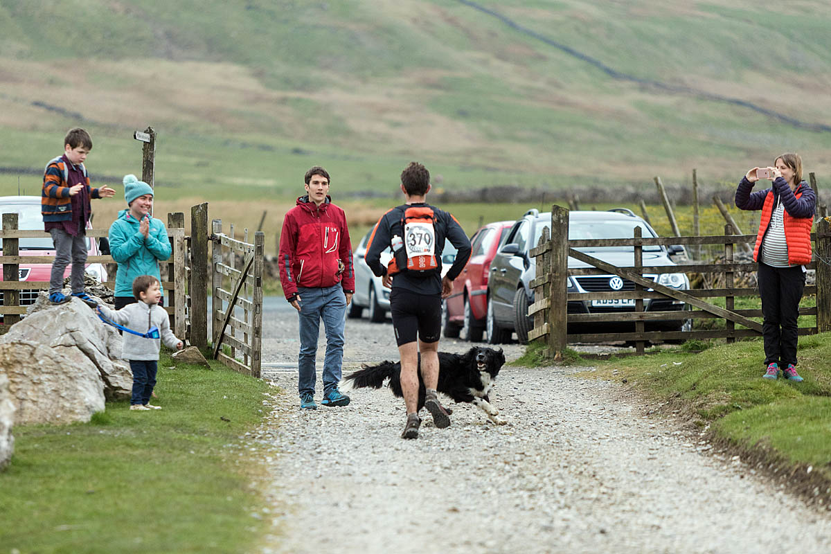 Chris Perry receives encouragement from three-times Fellsman winner Adam, along with Chris's family and a four-legged supporter. Photo: Bob Smith/grough