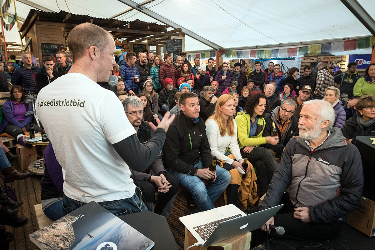 Lake District chief executive Richard Leafe, left, campaigns for the bid at Kendal Mountain Festival with acclaimed mountaineer Sir Chris Bonington. Photo: Bob Smith/grough