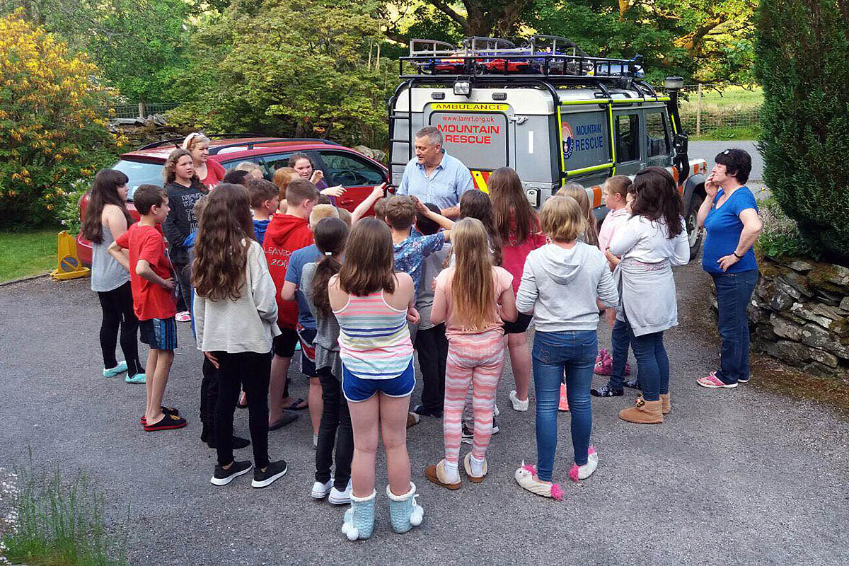 Nick Owen shows the young people of St Mary's School, Davyhulme how mountain rescue works. They donated more than £100 in return