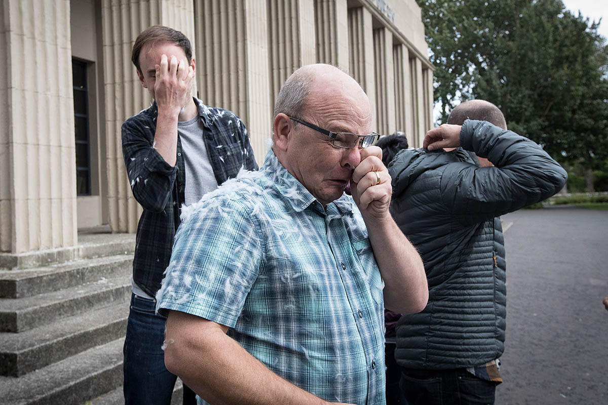 Or perhaps the fowl are confused for, hanging on the wind are feathery wisps and the humans outside the former Palace of Arts appear to have grown plumage.