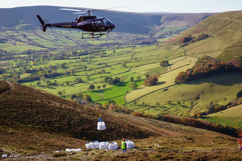 A helicopter airlifts stone on to the Ringing Roger path on Kinder Scout as part of last year's campaign. Photo: Adam Long