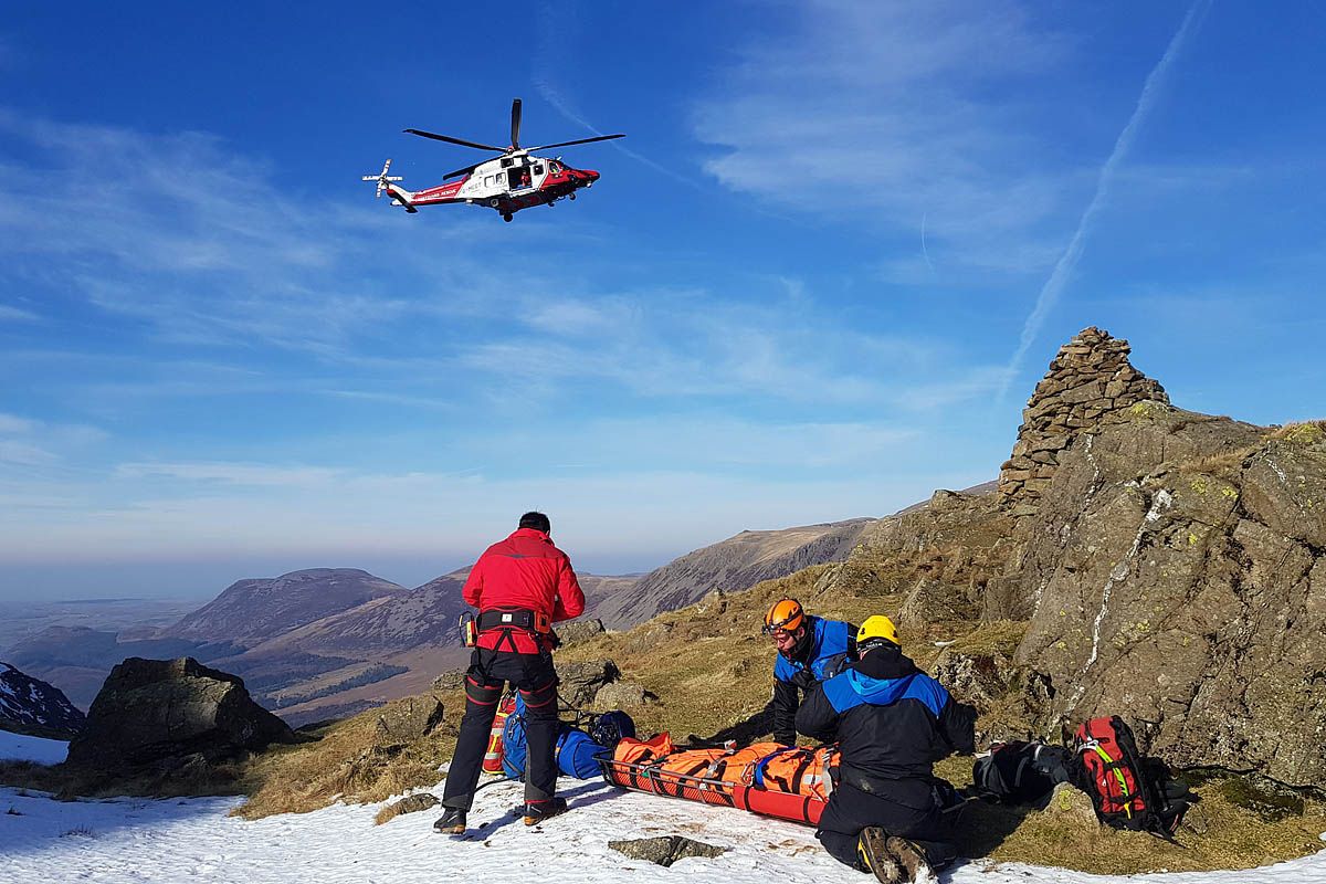“The three team members, kit, and the helicopter winchman-paramedic were winched down to the casualty. His injuries were assessed and he was packaged in a stretcher and winched on board R199 [the helicopter] and transferred to Cumberland Infirmary, Carlisle.