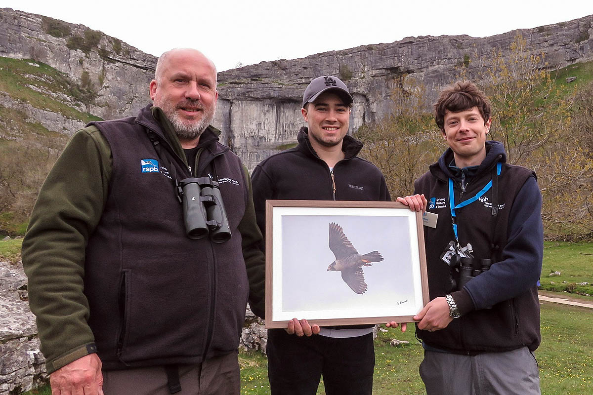 Bosses at the Malham Peregrine Project presented a signed photograph of a peregrine falcon to the 250,000th visitor Jamie Brown.