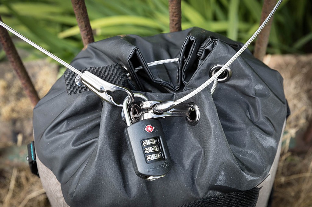 The cable locking system secures the bag to an object and also stops the pack being opened. Photo: Bob Smith/grough
