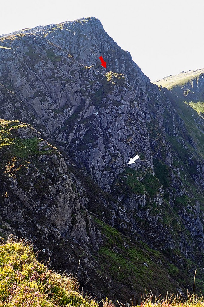 The rescue scene, with the position of the cragfast pair indicated by the white arrow and the site of the rescuers by the red arrow. Photo: Aberdyfi SRT