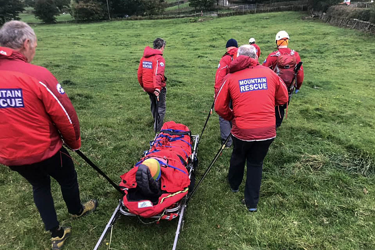 “His injury had been splinted and pain relief administered by the Yorkshire Ambulance Service. The team assembled a stretcher and carried the casualty to the waiting road ambulance.”