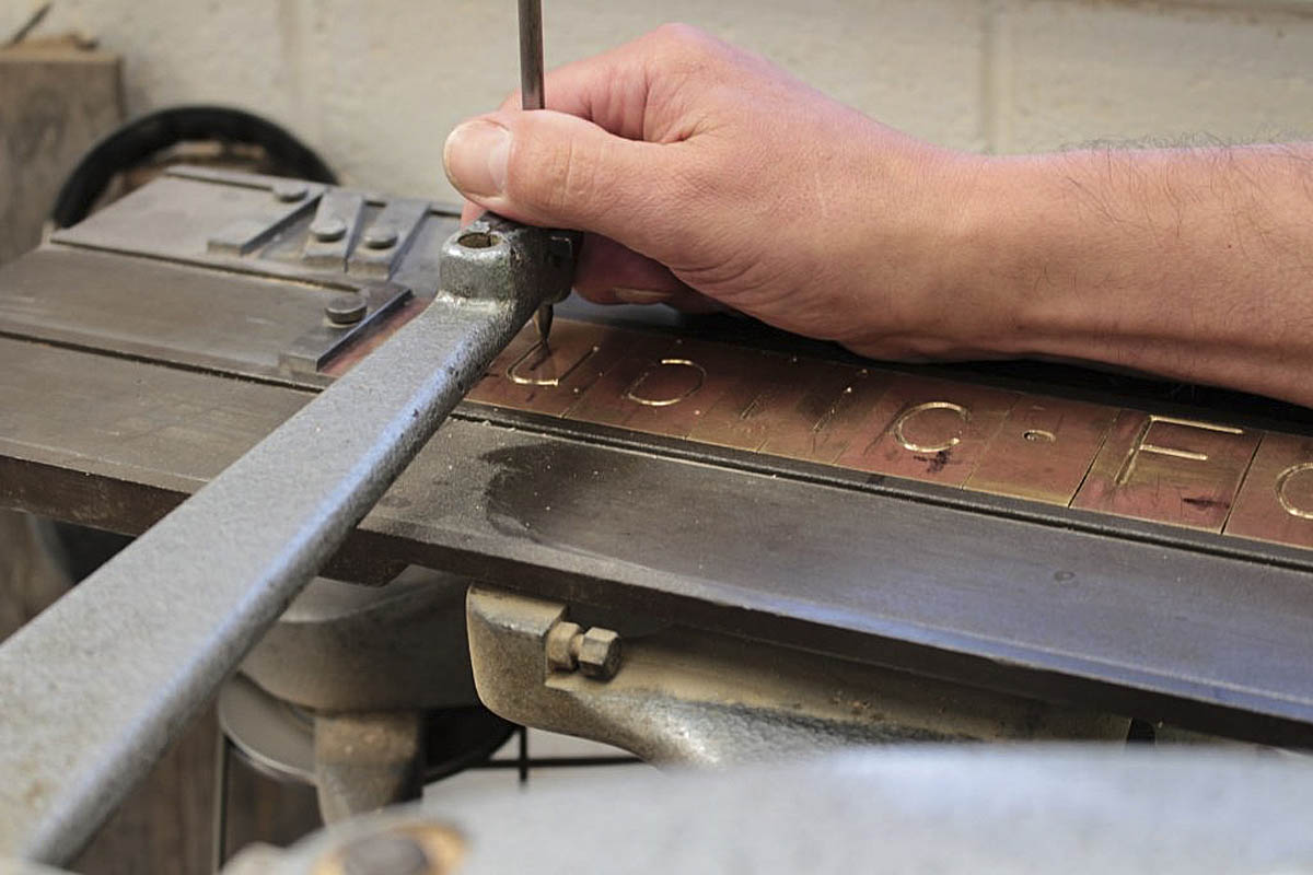 At his Grassington workshop, the first step for a new sign is to select the letters, or brass blanks. The fount used on the signs, or ‘copy’ as it is called, is ‘A Style Line’. The brass blanks are then laid on a bench and measured.