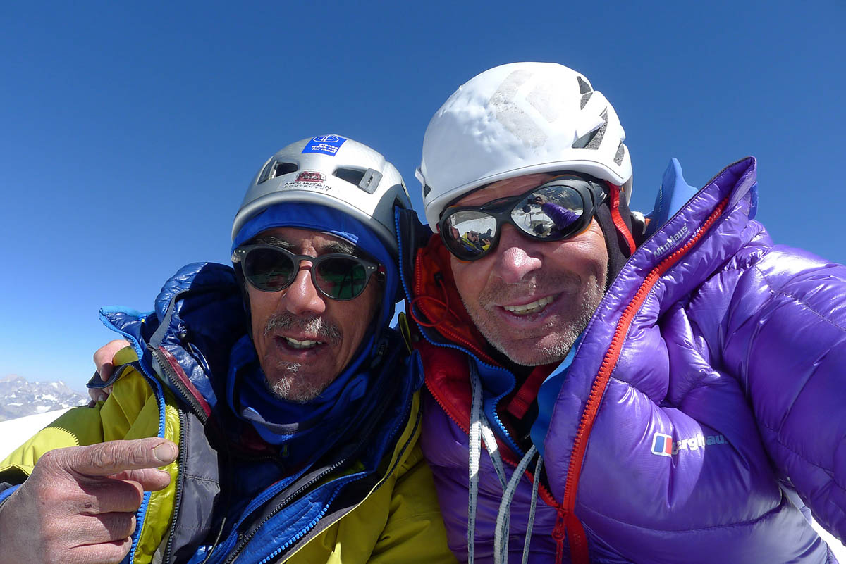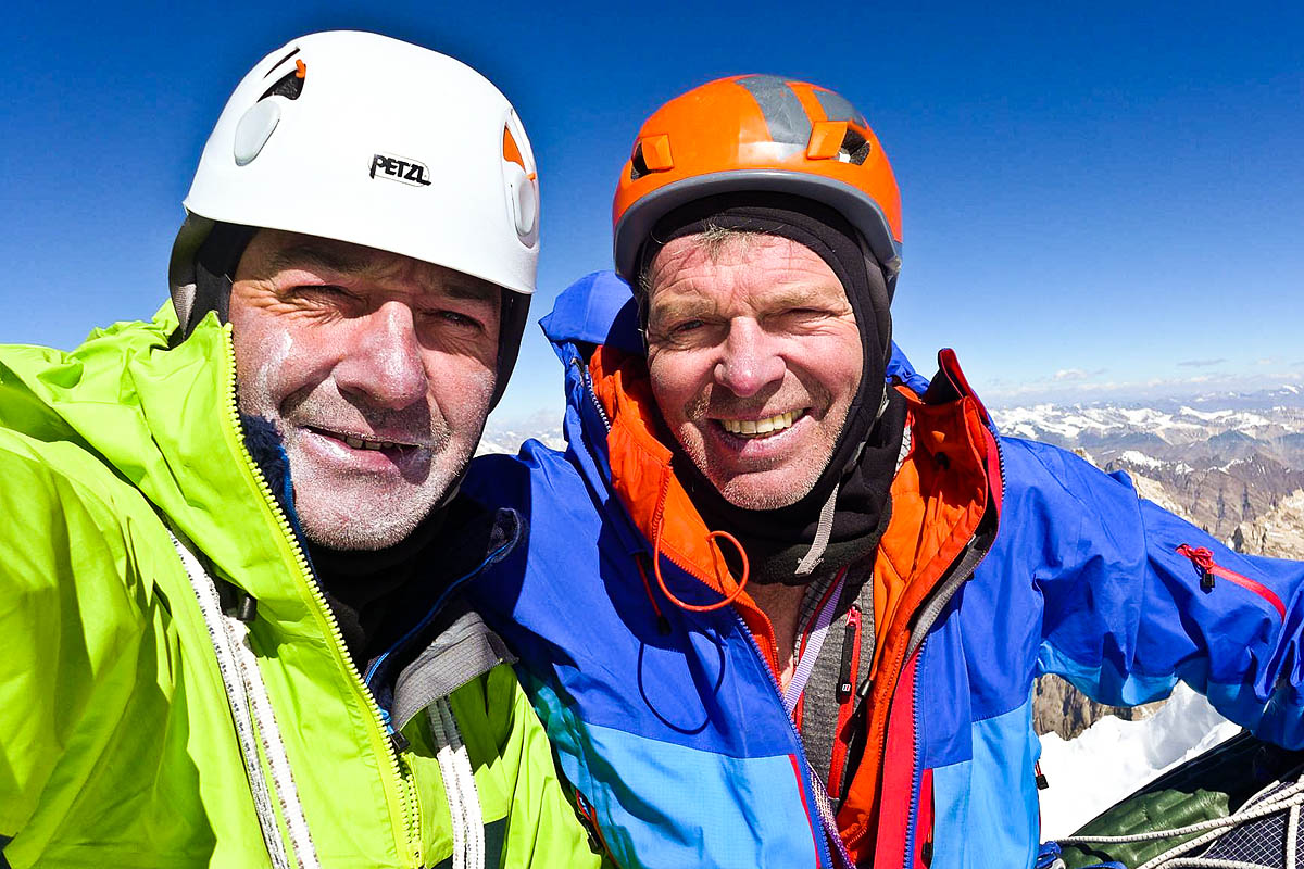 Vic Saunders, left, and Mick Fowler pose for a selfie on the summit of Sersank. Photo: Mick Fowler/Berghaus