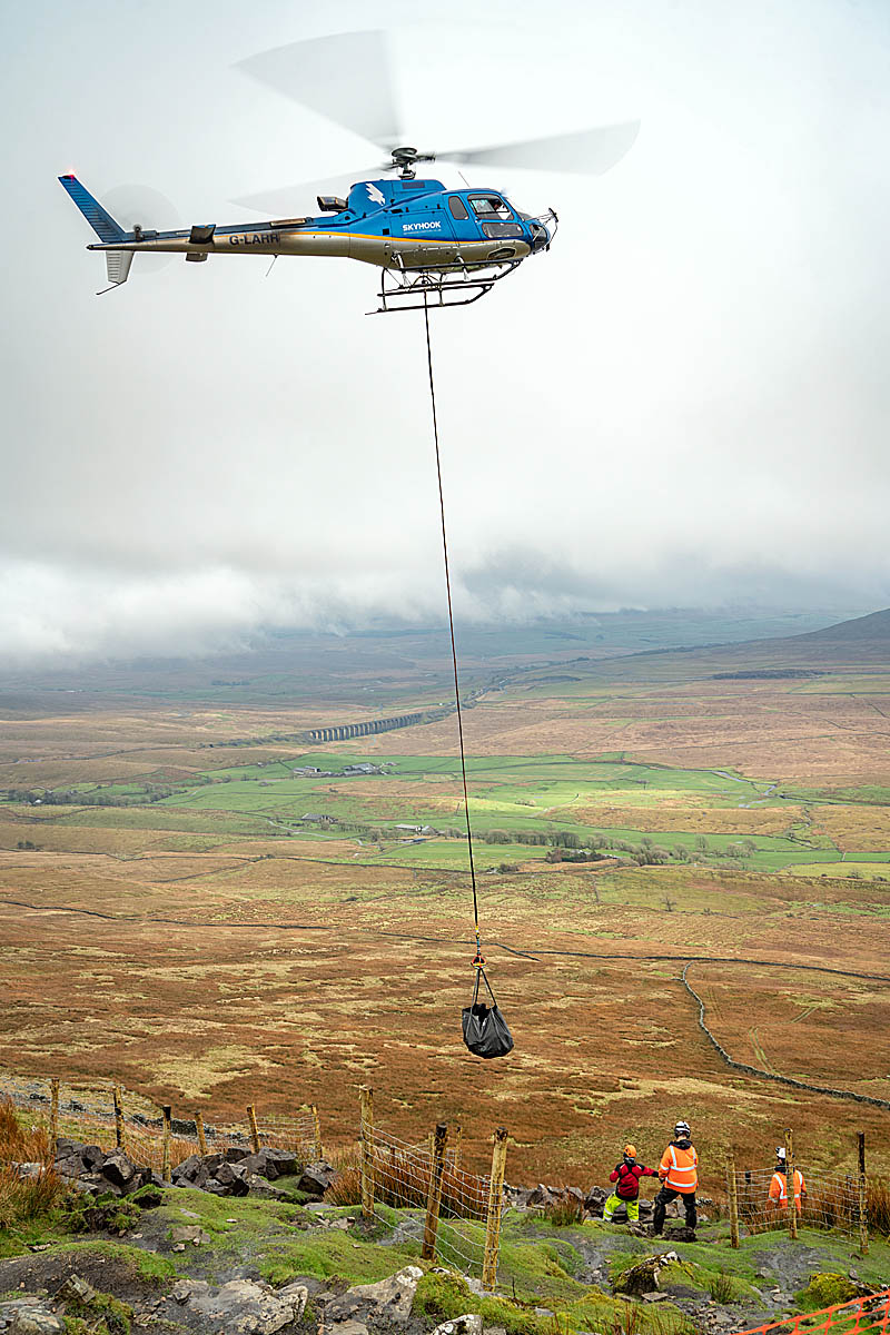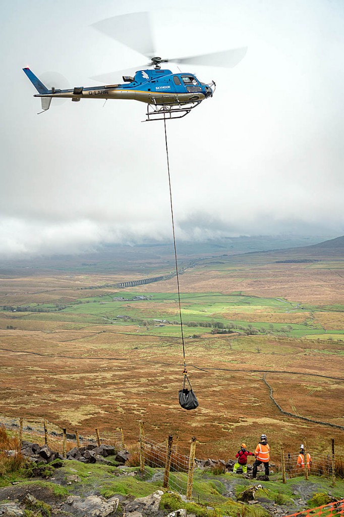 A helicopter has been used to airlift stone on to the flanks of Yorkshire’s highest mountain to repair a popular footpath.