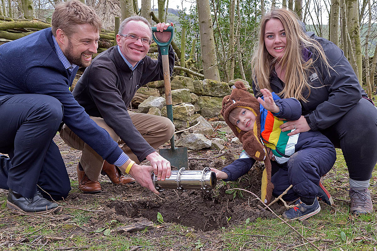 Burying the time capsule are, from left, Ian Priddle, manager of YHA Castleton; James Blake, chief executive of YHA (England and Wales), with YHA guests Jackson Holt, three, and Stephanie Hall