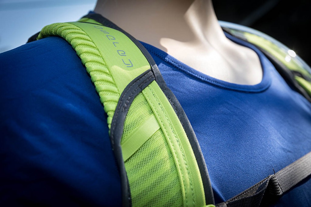 The rucksack is designed with good ventilation. The hack has two soft, ridged, foam-filled vertical sections with venting perforations between the ridges. In between these two pads is a central ventilation channel with mesh covering. The harness straps have mesh sections at the top of the shoulder section, then a foam padded section at collar-bone level, again with ridges similar to the back pads. Below this is another mesh section.