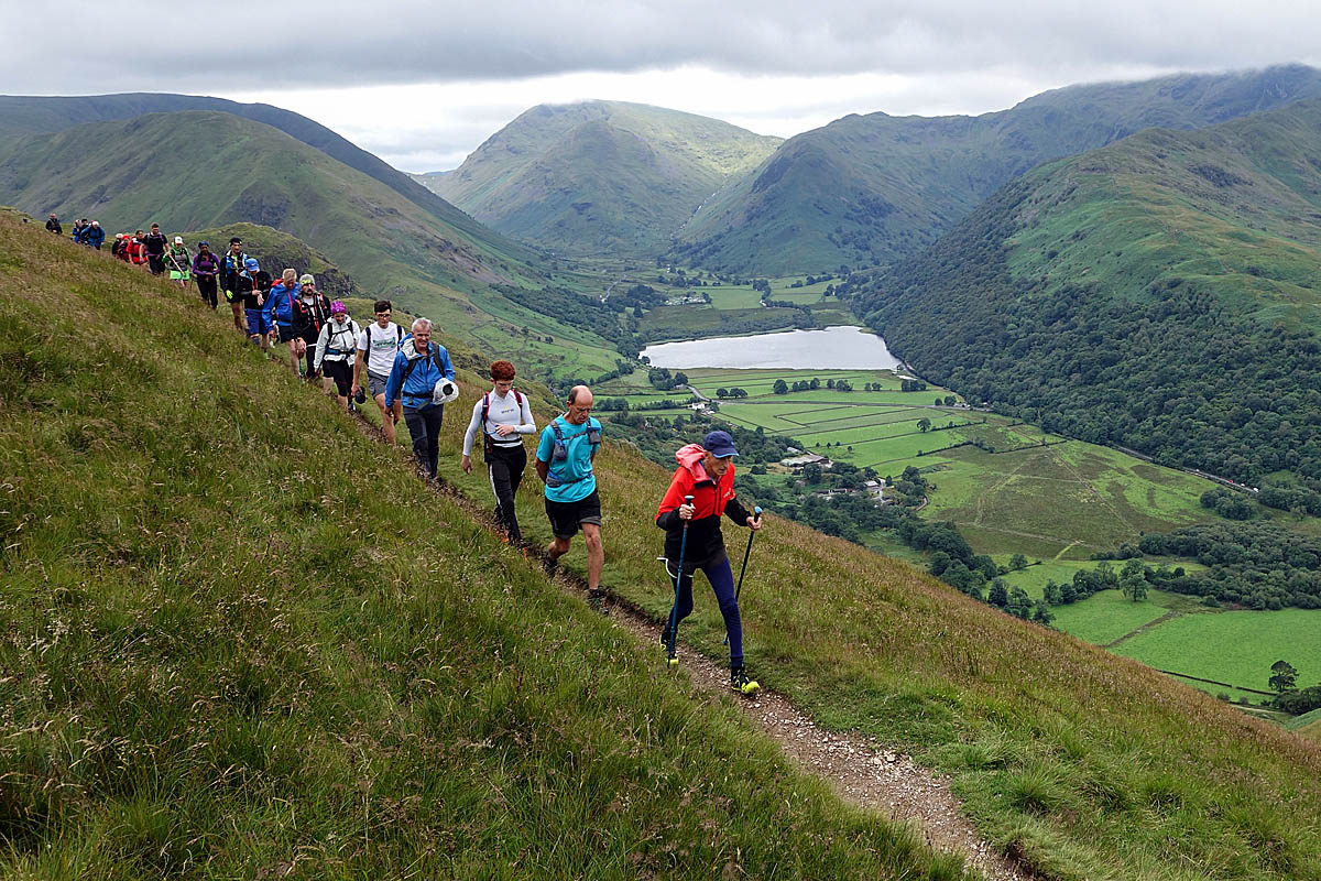 Joss Naylor heads a line of supporters on the descent into Patterdale. Photo: Scott Umpleby/Brathay Trust