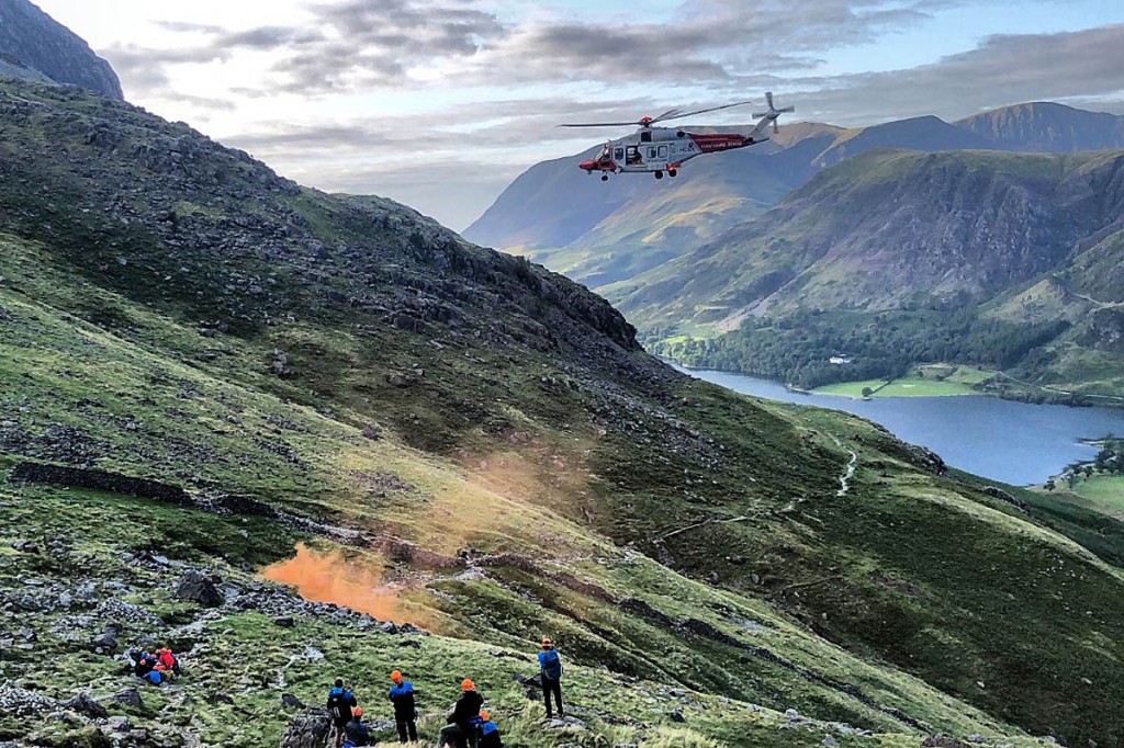 Team members made their way to the site from Gatesgarth Farm while the air ambulance doctor and paramedic treated the injured walker after the helicopter landed nearby.