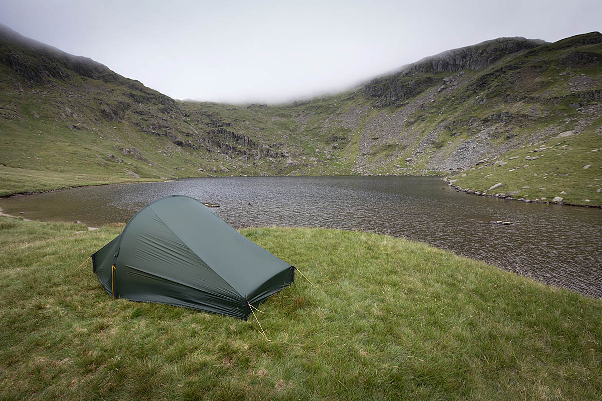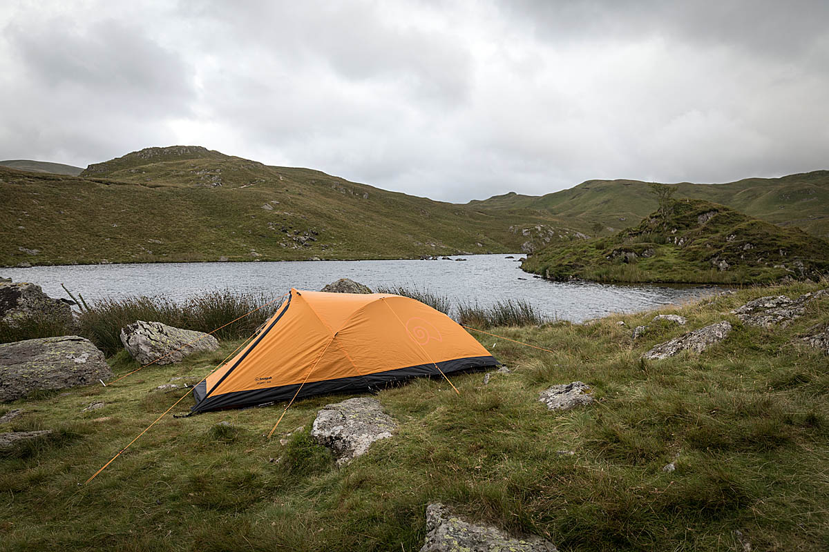 During our Lake District wild camp with the Snugpak tent, the wind whipped up to a brisk pace, but the Journey 2 coped well, resisting deformation very well in its guyed-out form. There was some flapping noise, but the tent remained stable.
