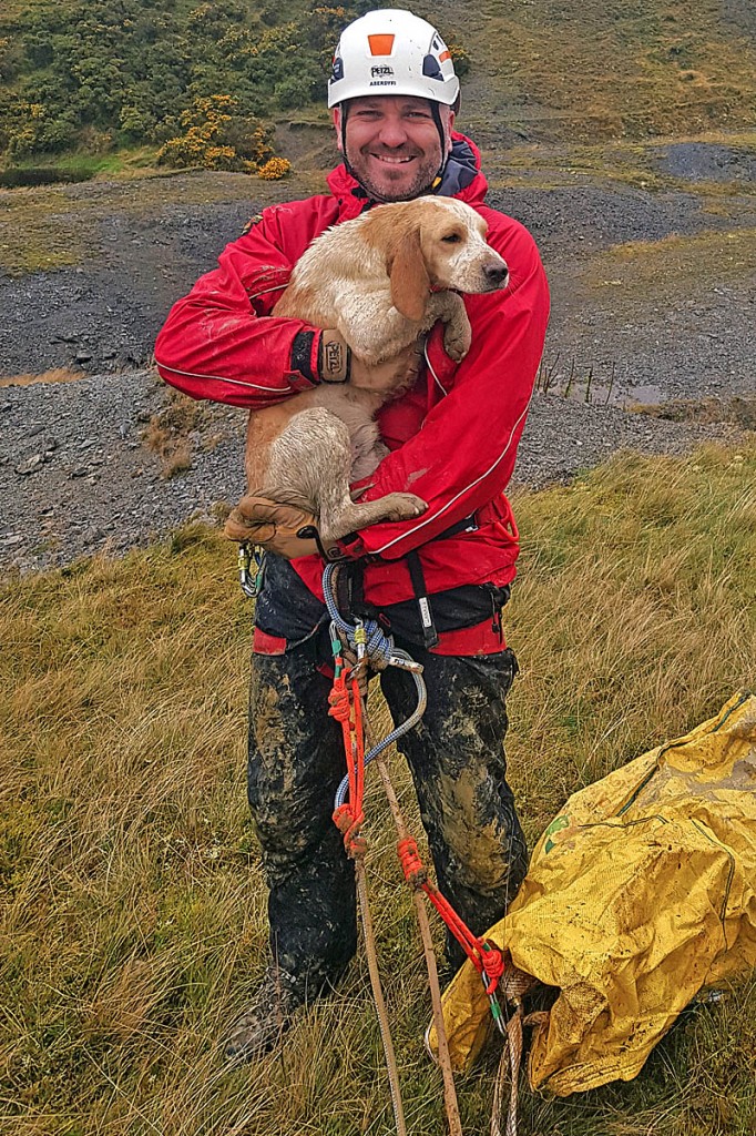 “The dog, very pleased to see the red jacket, co-operated beautifully, and was quickly loaded into a bag for transport upwards. Both rescuer and dog were a little dirtier for their troubles, and while the dog was passed back to its owners, the rescuer was hosed down courtesy of the fire and rescue service crew.”