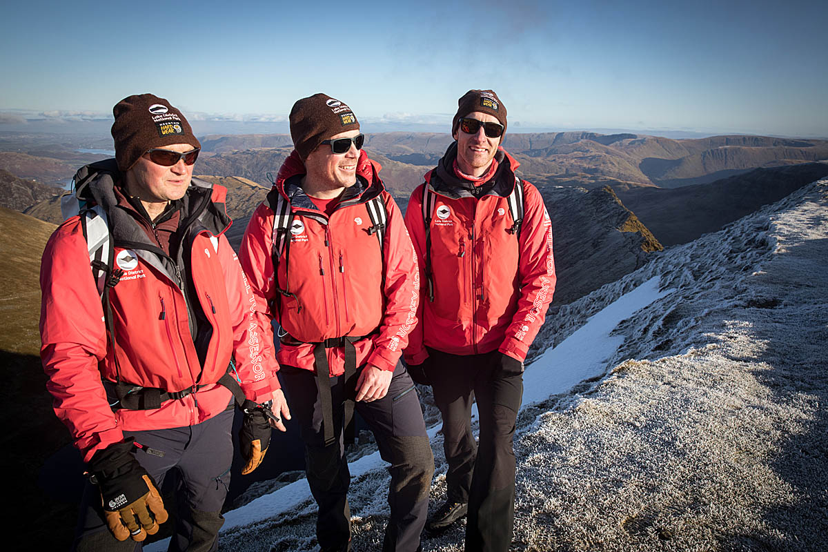 Grough joined the three men, Jon Bennett, Zac Poulton and new recruit Wes Hunter at the launch of the service on a near perfect day on Helvellyn. On a cold, crisp, sunny day, with just an odd wisp of mountain cloud brushing the toothy spikes of Striding Edge, we made our way to Red Tarn in the company of the three assessors, a regional television reporter, Lake District National Park Authority staff and representatives of the outdoor brands who clothe and equip the assessors.