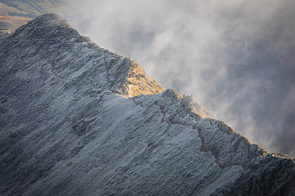 After leaving the three men to embark on a filming and photography session on Striding Edge, I headed up to the summit via a frosty Swirral Edge to find plenty of walkers and a few mountain bikers making the most of a stunning winter mountain day with the Lake District fells bathed in sunshine and crystal clear views of the national park’s peaks, and beyond to the Solway Firth and Galloway Hills, north Pennines and Morecambe Bay. I met them again on the summit of Helvellyn where more filming work followed, including drone shots of the three ‘Men in Red’ striding purposefully across the plateau.
