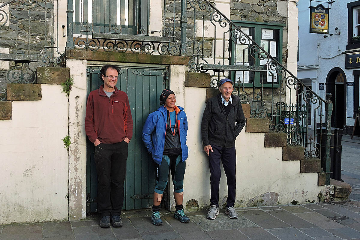 Sabrina Verjee is joined at the Moot Hall finish by Steve Birkinshaw, left, and Joss Naylor. Photo: Chris Lines