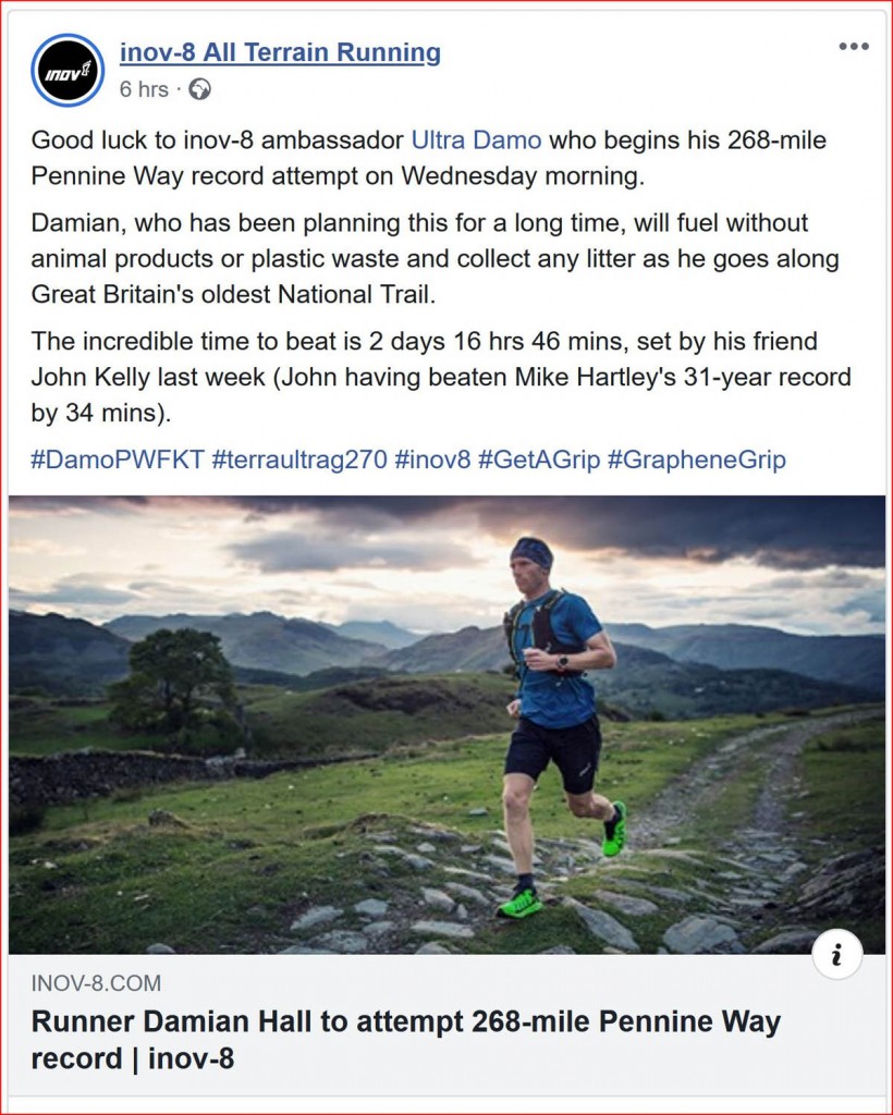 This time, the inov-8 ambassador is running the route from north to south, starting at Kirk Yetholm in the Scottish Borders. He said he hopes to arrive in Edale in time for last orders on Friday after forsaking alcohol for the past four months.