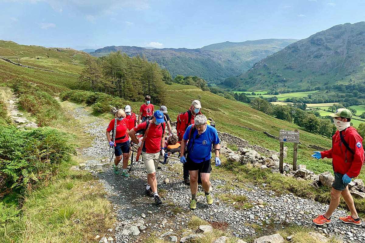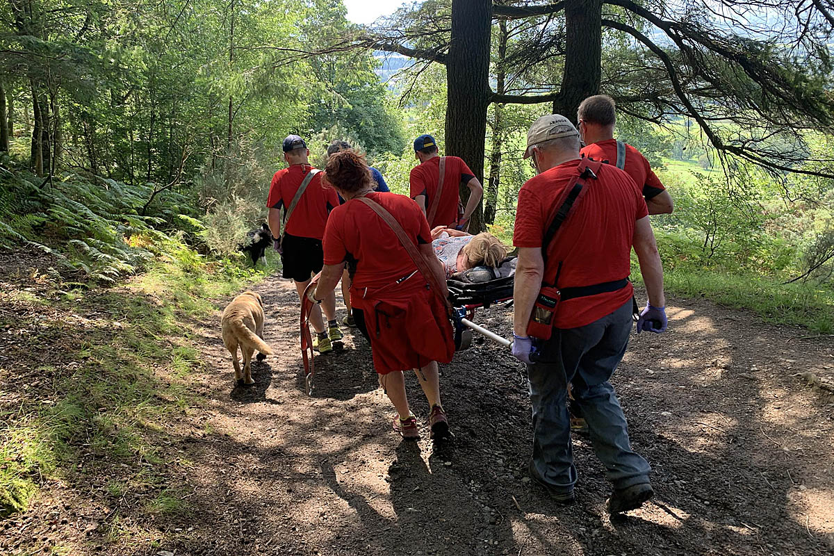 “With this pincer movement she was soon located. The ankle was assessed, pain relief provided, bandaged and splinted. She was then stretchered down the path where an ambulance transported her to hospital at Carlisle.”