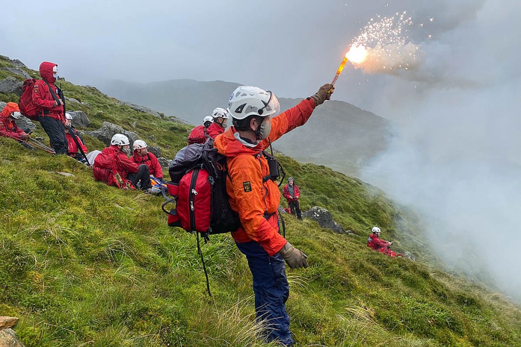 “Creeping under the cloud, the helicopter crew winched team members into Bwlch Tryfan. From here, the heavily laden mountain rescue troops made their way over the greasy rocks and boulder fields to the summit and descent into the top of Western Gully.