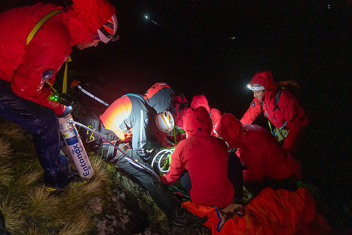 “The man’s successful attempts to not tumble in order to avoid potentially far more serious injuries meant that all the impact had been on his lower back, ribs and leg. Strong analgesia was given before immobilising him in a vacuum mattress and placing him on a stretcher for a rope-assisted lower down the mountain.”