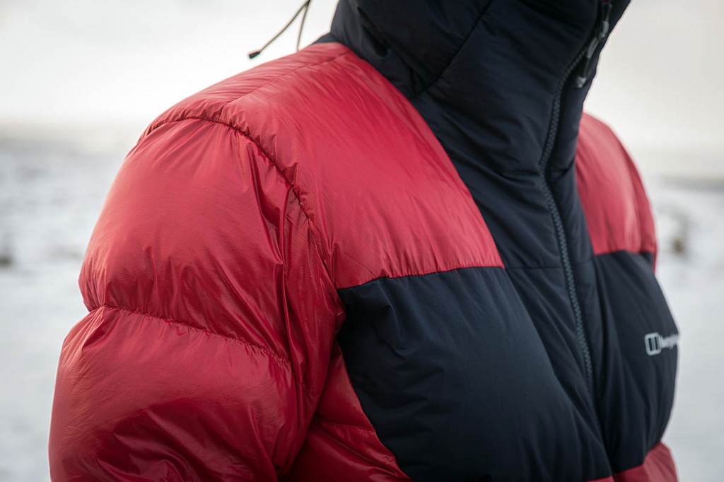 The jacket has fairly narrow stitched-though baffles which kept the down in place well. The Pertex Shield fabric in the upper sections are overlaid on the baffled compartments so there’s no seeping through of water.