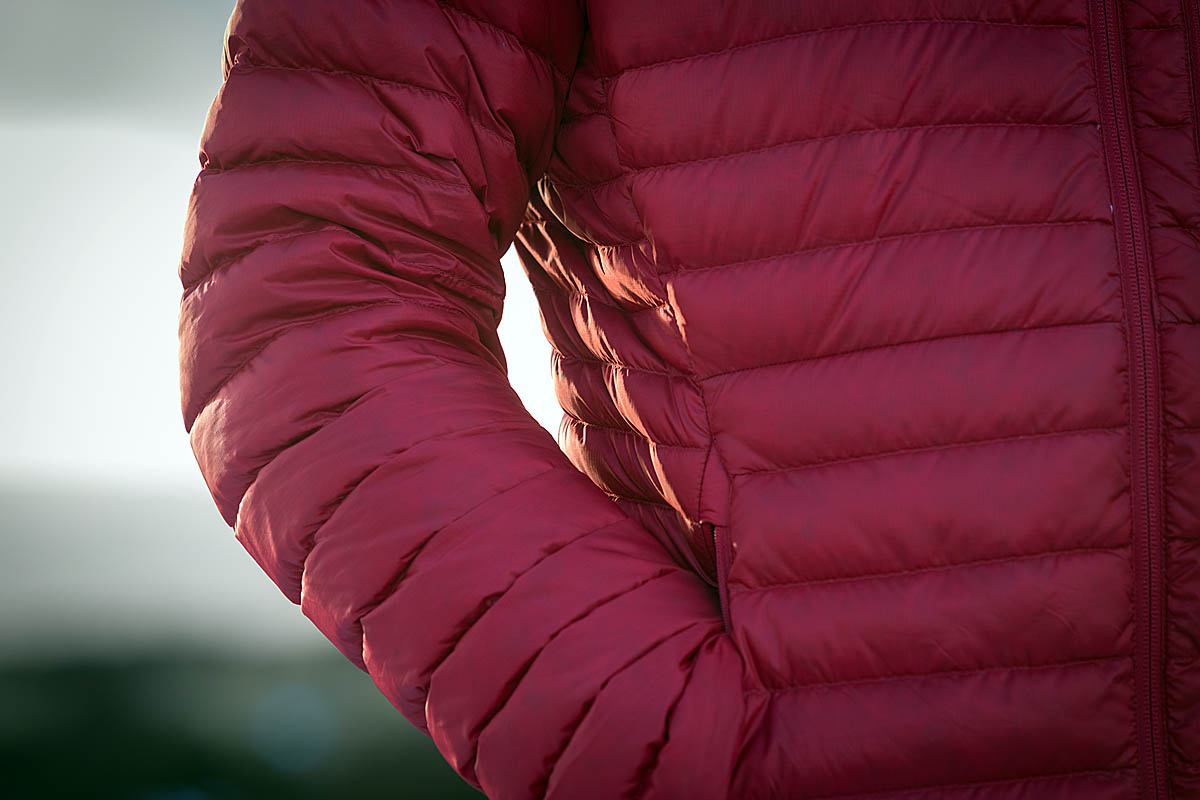 The jacket has zoned insulation, with wider baffles in the main areas of the front and back of the garment and sleeves, and narrower baffles at its sides.