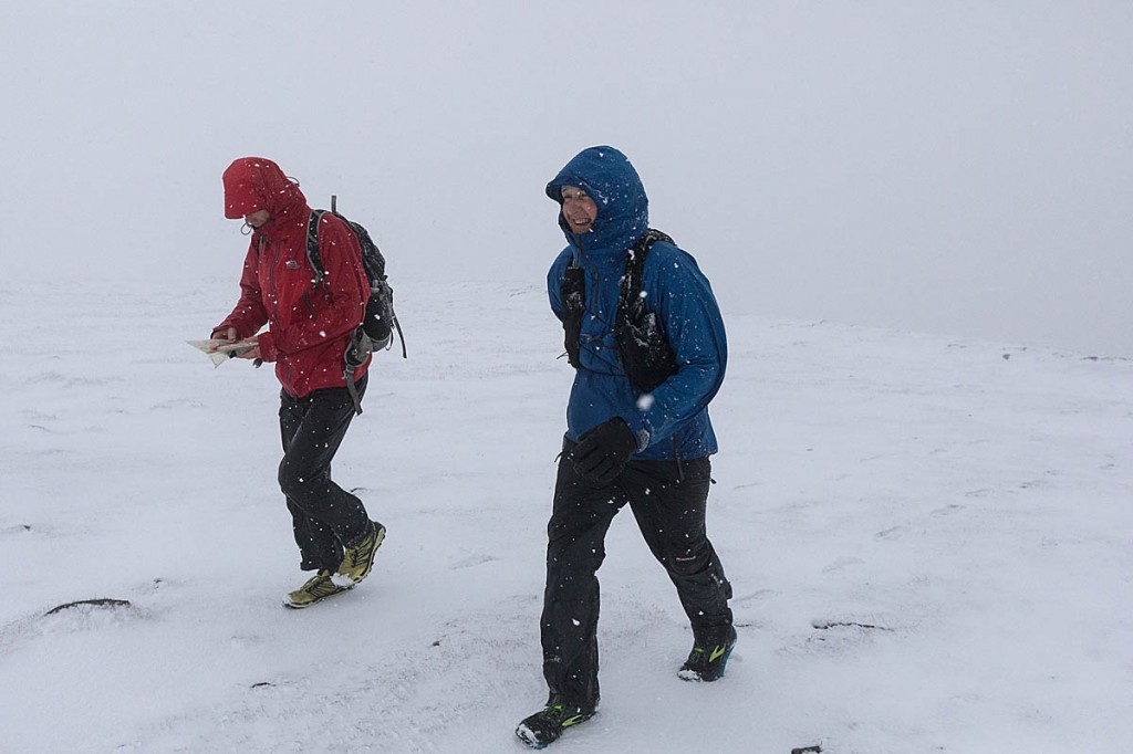Brian Melia and his pace runner battle winter conditions on the summit of Ingleborough on the final day of his A Pennine Journey run. Photo: Bob Smith/grough