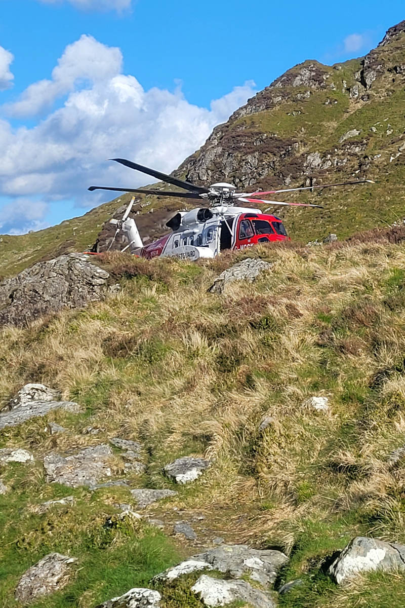 “Coastguard helicopter Rescue 936 arrived on scene just as the hill party reached the casualty. The helicopter paramedic made an assessment of the casualty, and the decision was made to airlift the casualty to Bronglais Hospital, Aberystwyth.”
