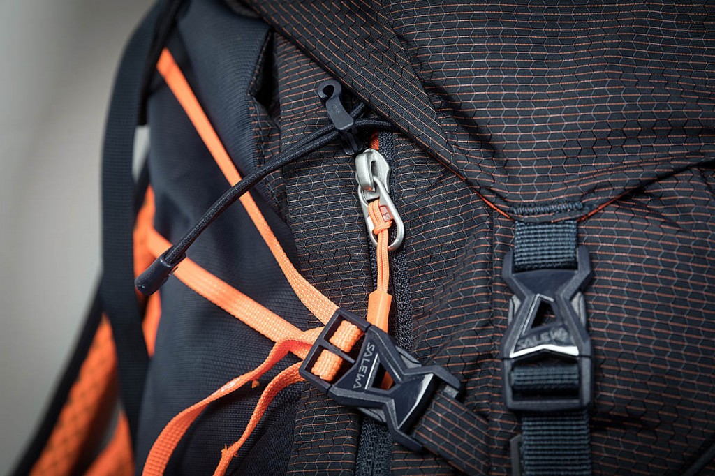 The Salewa rucksack uses a mixture of honeycomb-pattern and twill material, both 100 denier nylon. There’s a separate zipped lower compartment with a divider incorporating a drawstring which can be opened up to create a larger single area with the main compartment.