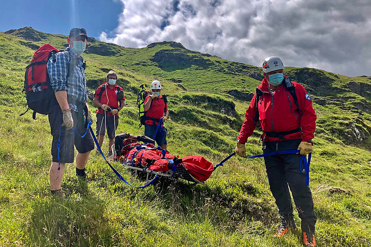 Unable to bear weight on the injured limb, he called for help. Team volunteers made their way from Bwlch Oerddrws car park to the injured walker’s location with stretcher and medical equipment. He was assessed and the limb splinted before he was loaded onto a stretcher to be taken back down the mountain.