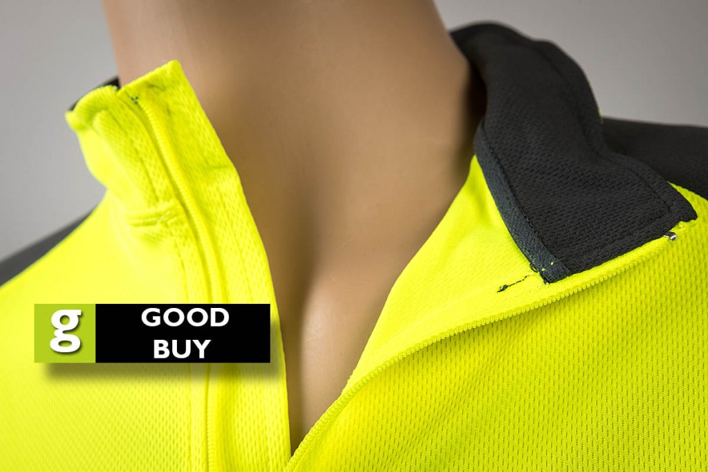 The fabric is stretchy and hugs the body well, and the weave allows good wicking. The zipped neck also helps provide cooling when undone, but closes to provide protection to the neck when needed. The main body of the sample we tested was bright yellow, useful for visibility when out on the bike, with side panels, shoulders and sleeves in dark grey. More muted versions, in navy blue or black, are also available.