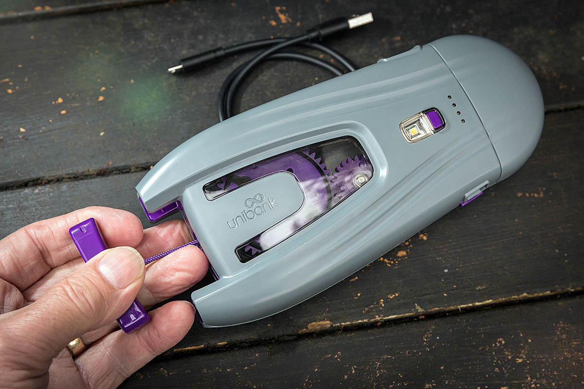 As well as using the pull cord, the Unibank can be charged more conventionally, using the supplied micro USB lead. The unit has an input socket and an output socket. The lead can be plugged into the output socket and connected to the device you want to charge.