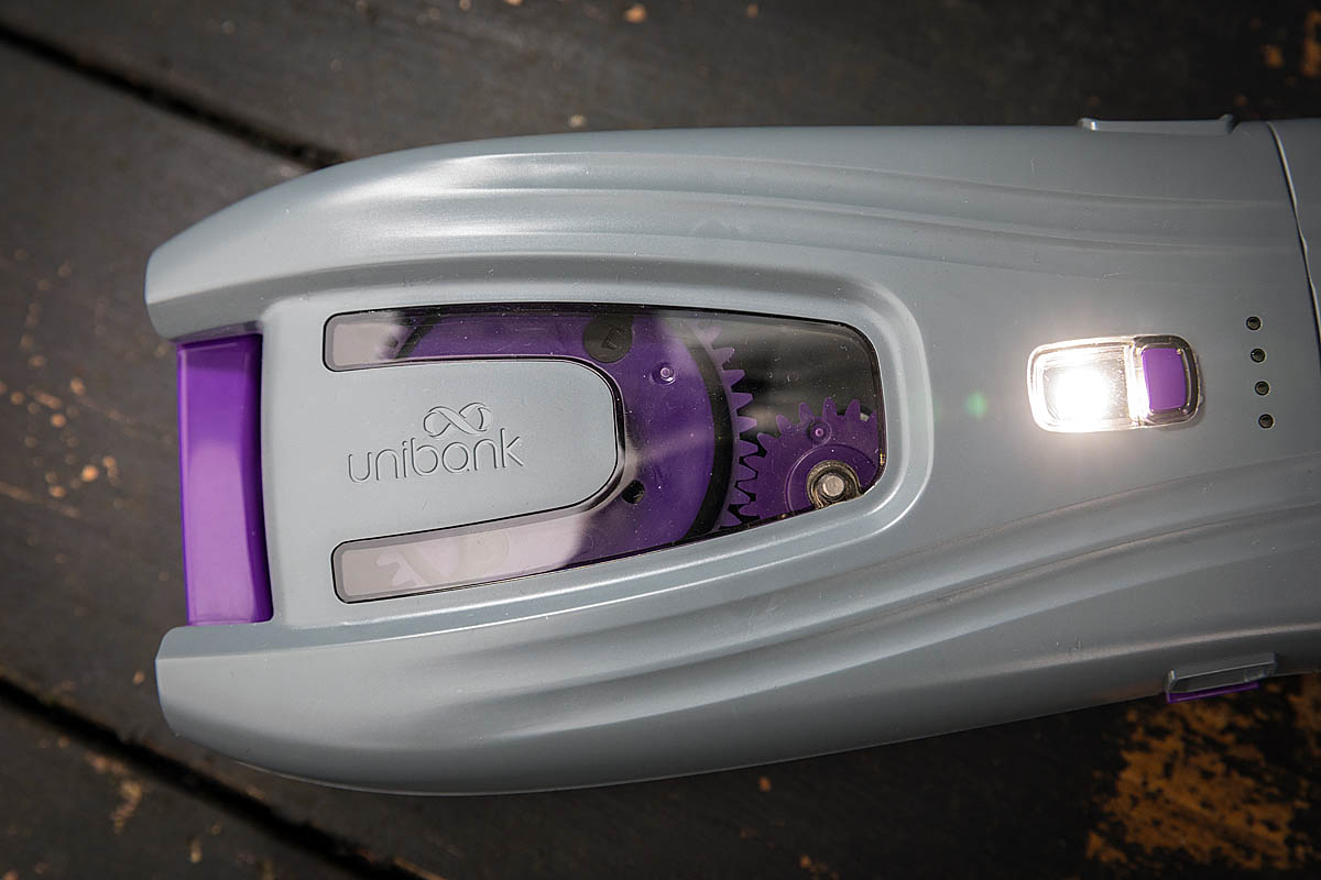 The unit also has a button on its top side that, when pressed, gives an instant indication, via four LEDs, of the Unibank battery’s charge. Pressing the button twice turns on a small LED torch.