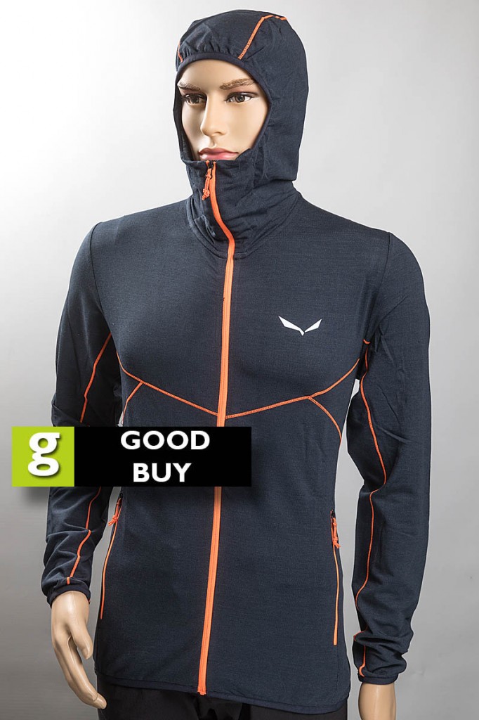 The Light Micro Polarlite Full Zip Hooded Jacket packed down smallest of all the tops in the test, and was among the lightest. It dried quickly after getting damp in a sharp shower. The Salewa midlayer performed best in warm to cool conditions and when moving fast. Windblocking was good.