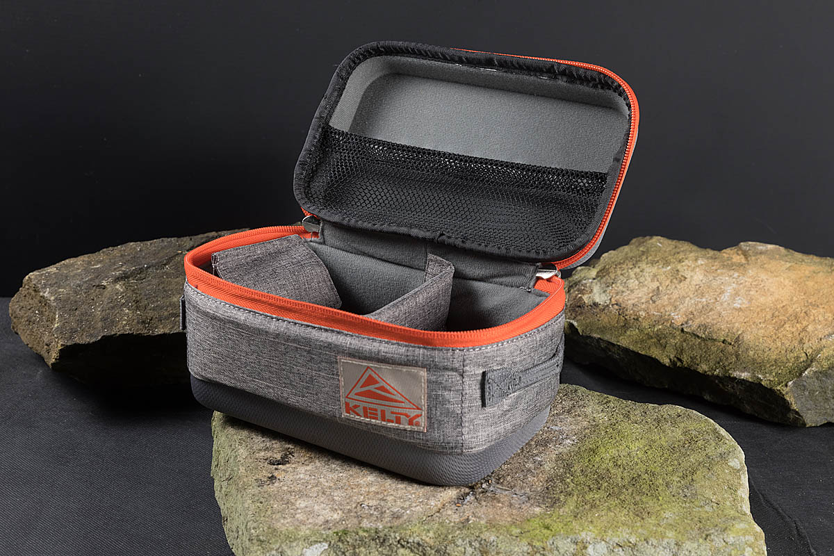 The Cache Box has a moulded base and lid, with a zip closure. Inside, there’s foam padding and a movable divider to help keep things in place, plus a small pouch with lid for bits and pieces. Both have hook-and-loop strips to attach in the desired position. There are also two elasticated bands in the lower part of the box, and the lid has a mesh pocket.