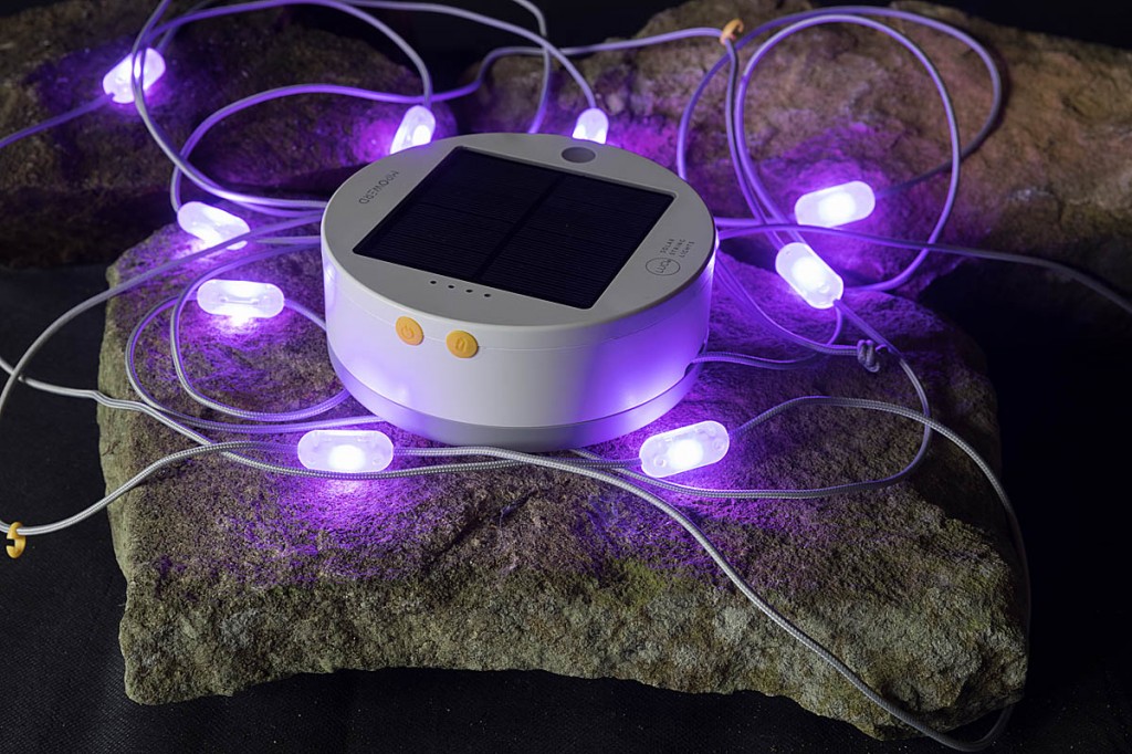 The Luci Solar String can be powered by plugging into a source using a micro-USB lead or via its solar panel. Four LEDs on the outer case show how much charge the unit has.