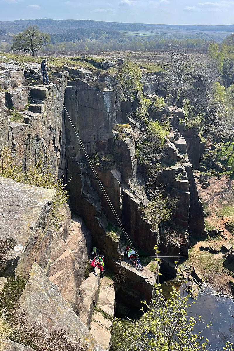 Rescuers packaged the climber into a stretcher then used a long top-rope system held under tension by a guide line to enable the stretcher and its occupant to be pulled over the pool, described by rescuers as ‘quite rank’, to the quarry floor.