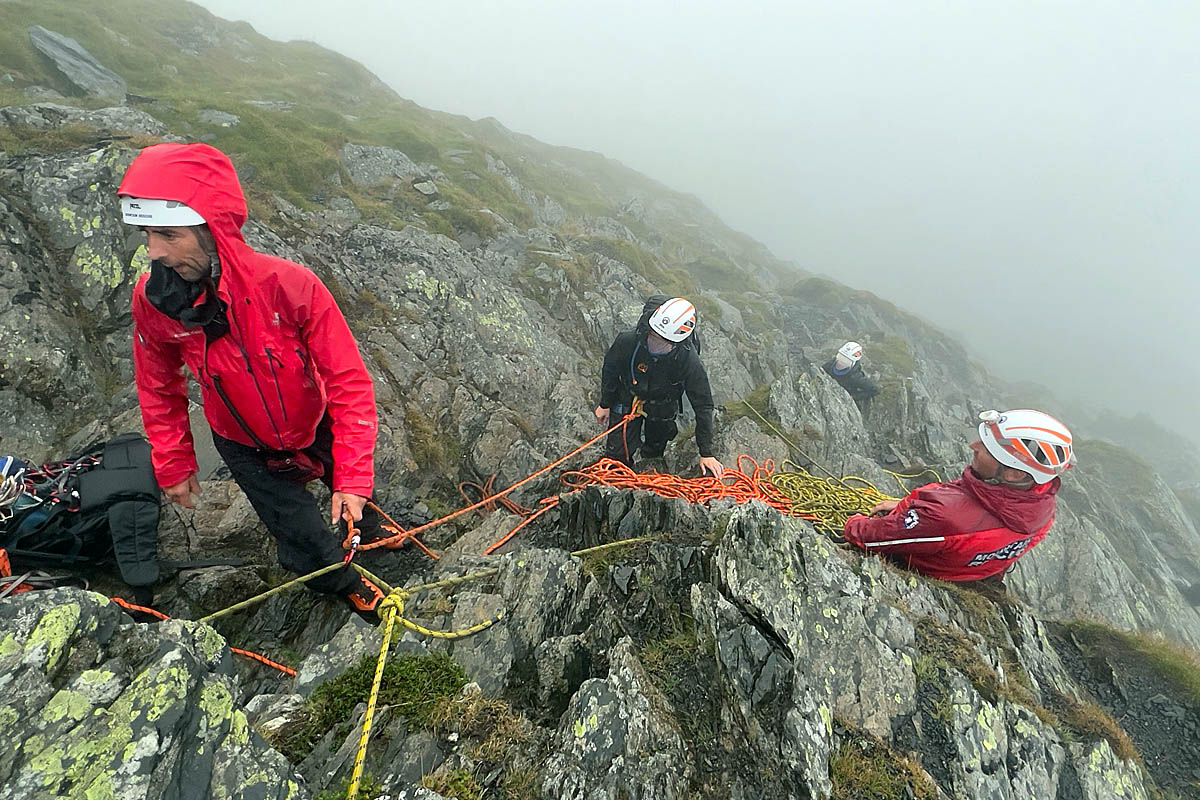 A small number of Keswick MRT members made their way to the top of Sharp Edge and, after finally locating the couple in the mist, set up a rope system to enable them to be brought up 50m to the ridge.