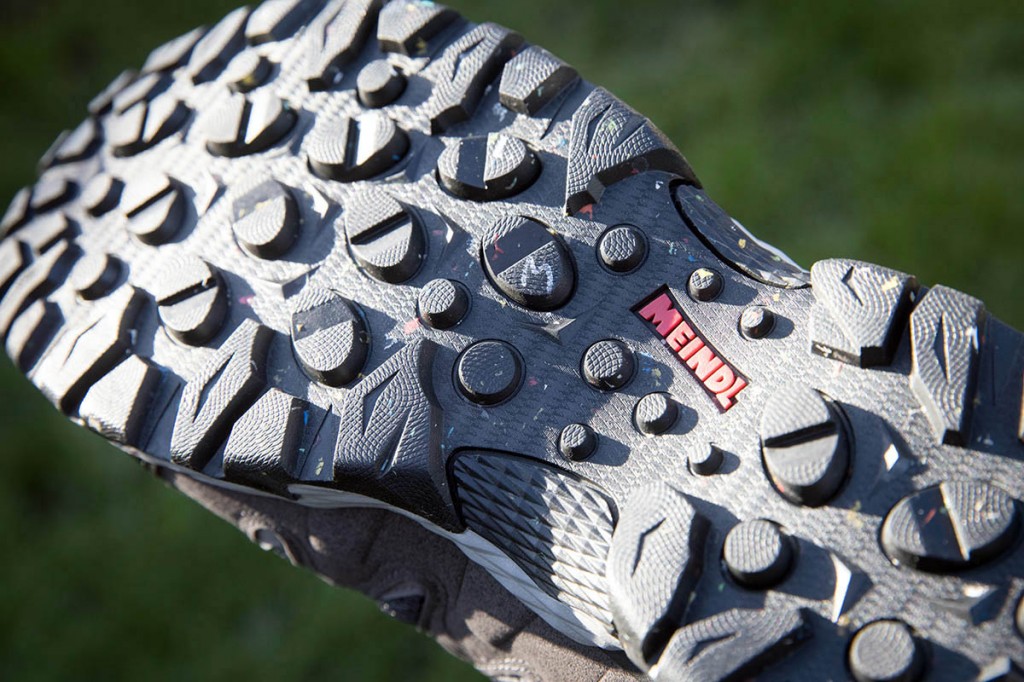 The outsole is Meindl’s own unit, made with 22 per cent recycled rubber, using the brand’s production offcuts, hence the multicoloured speckles in the design. The lugs are elliptical and hexagonal and gave good grip on a mixture of terrain surfaces. Traction and braking on wet rock were very good.