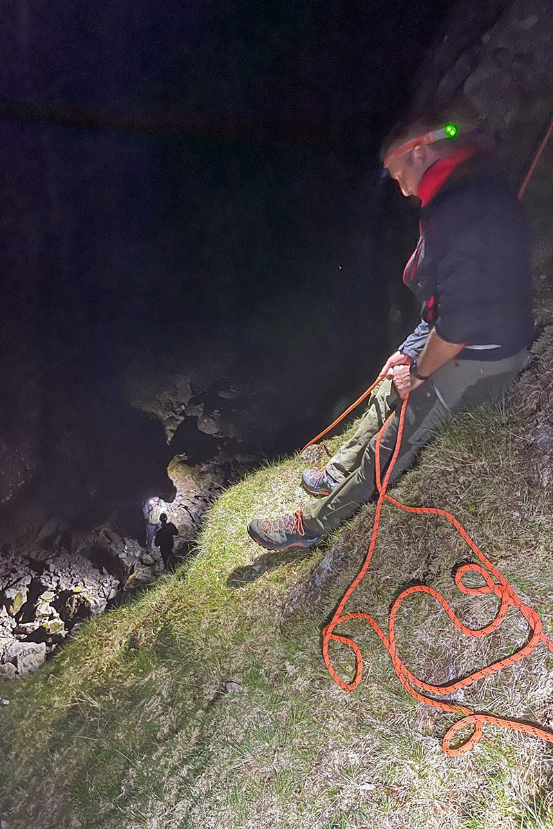 “A couple were found by the search dog in the deep steep-sided gully unable to get out. A team member descended on a rope into the gully to help attach harnesses and helmets before the pair were able to climb out with the safety of a rope from above.