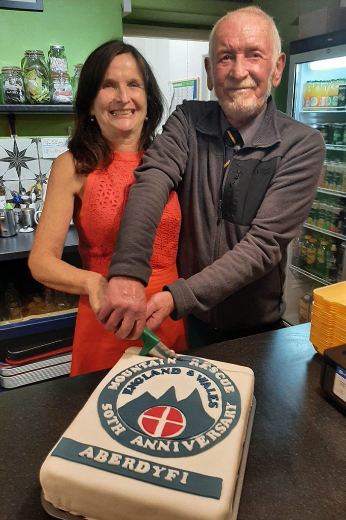 Team secretary Siân Campion cuts a cake with team chair and longest serving member Dave Williams, who joined in 1974