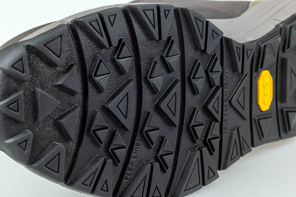 The outsole is Vibram’s Fuga model, which uses MegaGrip compound. The ‘self-adaptive’ lugs are up to 4mm deep, but there are flex lines – lateral channels in the outsole which, as the name suggests, allow the sole to bend with the natural walking movement. There’s no step at the heel section but it does have a deeper t-shaped channel at the heel. Overall grip from the boot was very good, with traction and braking on rock from the MegaGrip very assured.