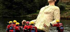 Rescuers had to wade into ankle-deep water to help a romantic character from his place in the middle of a lake.